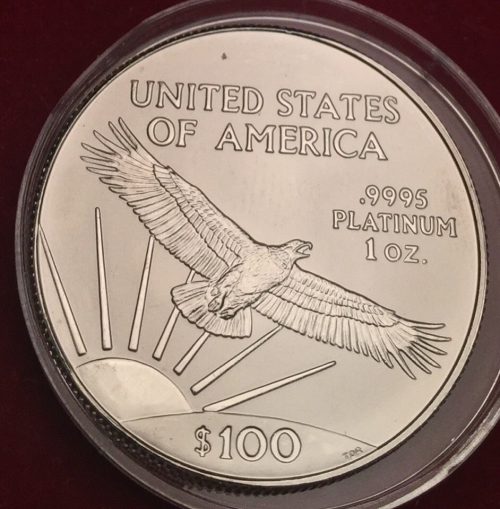 Аверс: Изображен орел в полете на фоне восходящего из-за линии горизонта солнца и его лучей. Сверху стоит надпись в две строки: «UNITED STATES OF AMERICA» (Соединенные Штаты Америки). Справа сверху от орла находятся следующие обозначения в три строки: «.9995 PLATINUM 1 OZ.» (проба 0.9995, платина, 1 унция). На стилизованном изображении земли внизу стоит информация о номинале: «$100» (100 долларов).