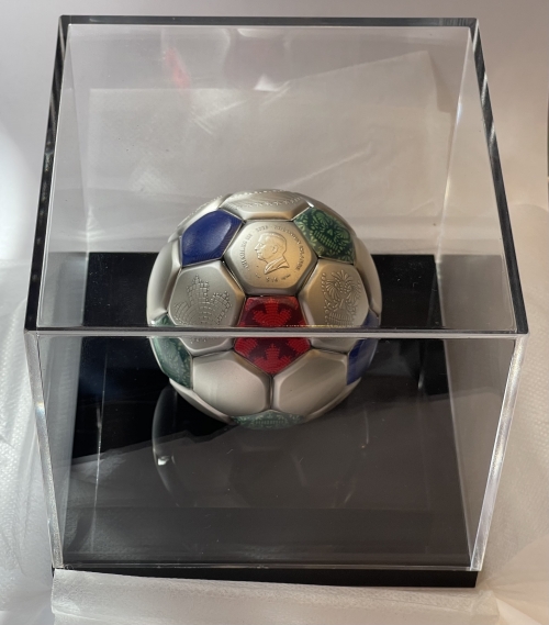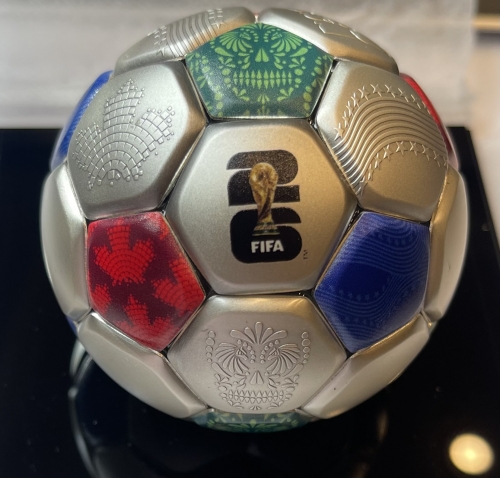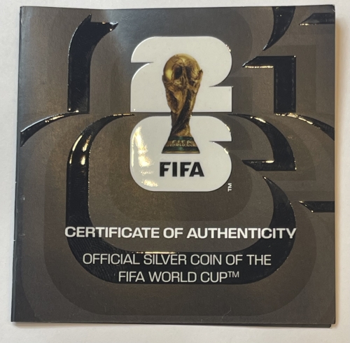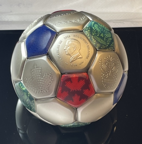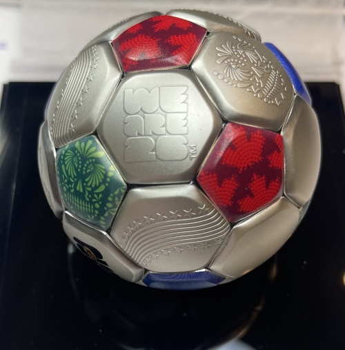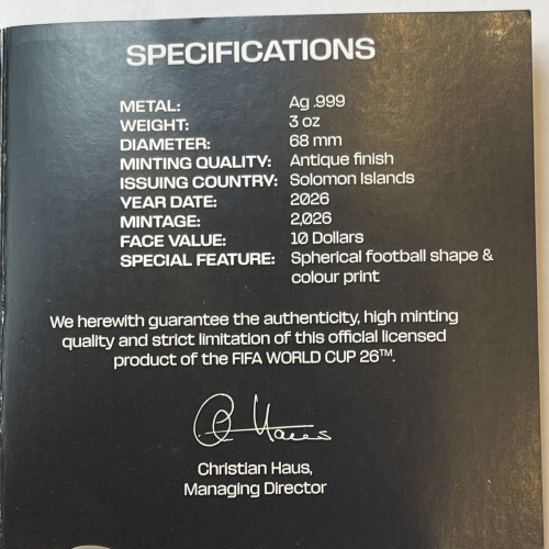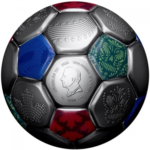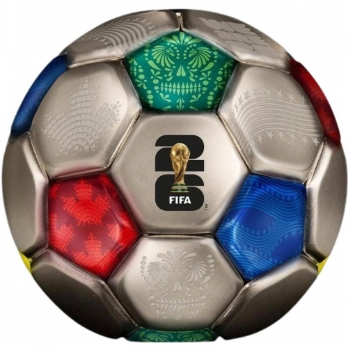 Эта удивительная серебряная монета весом 3 унции посвящена Чемпионату мира по футболу FIFA™ 2026 года. У нее сферическая форма футбольного мяча с античной отделкой. Поставляется в специальном футляре с сертификатом подлинности. Тираж: 2026 штук.
